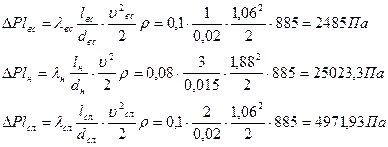 7.2.2 Определение потерь давления на участке гидросистемыПотери давления делятся на два вида: потери давления по длине, возникающие преимущественно на прямолинейных участках гидролиний и обусловленные действием сил гидравлического трения, и потери на местных сопротивлениях, причиной которых является деформация потока жидкости при прохождении через аппараты, устройства и соединительную арматуру. Потери давления зависят, при прочих равных условиях, от режимов движения жидкости, а также от размеров и шероховатости внутренних поверхностей трубопроводов. Наибольшее влияние на величину потерь давления оказывает скорость течения жидкости. Максимальную скорость течения жидкости в гидролиниях ограничивают величиной 10-15 м/с. Превышение указанных пределов приводит к существенному увеличению потерь давления и может вызвать образование местных зон пониженного давления (кавитацию). Необоснованное занижение скорости течения жидкости приводит к увеличению диаметров трубопроводов и, следовательно, к увеличению массы и габаритов всего привода. Принимаем рекомендуемые значения скорости масла: - для всасывающих гидролиний, по которым масло движется к насосу υвс =1 м/с; - для нагнетательных (напорных) гидролиний, соединяющих насос с гидродвигателем в зависимости от рабочего давления (т.к. Р ≤5 МПа) υн =3 м/с; - для сливных гидролиний, по которым отработанная жидкость возвращается в бак υсл = 1,5 м/с. Определяем ориентировочный максимальный расход масла Q