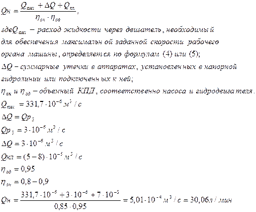 При этом меньший запас устанавливается для приводов среднего и высокого давления (5 МПа ≤ Рн ≤ 10 МПа), и больший – для приводов низкого давления (Рн ≤2,5 МПа). 7.2.7 Определение минимально необходимой производительности насоса В системах с дроссельным способом регулирования скорости двигателей производительность насоса, а следовательно, и мощность, потребляемая им, постоянны. Характерным для этого способа является превышение производительности насоса над максимально необходимым расходом масла через гидродвигатель. При таком условии избыточная часть жидкости отводится от насоса через предохранительный клапан в бак. При работе насоса, с ростом давления Рн , его производительность Q н убывает в связи с увеличением внутренних утечек через зазоры в спряжениях трущихся пар насоса. Расход жидкости, создаваемый насосом в напорной гидролинии системы, на своем пути к гидродвигателю уменьшается вследствие утечек в аппаратах, имеющих напорные и сливные полости, а также дренажные гидролинии ( гидрораспределители, редукционные клапаны и т.п.). При прочих равных условиях утечки зависят от величины зазора, соединяющего полости с разным давлением внутри устройства, от перепада давления и от вязкости рабочей жидкости. Они снижают скорость выходного звена привода, вызывают интенсивный разогрев жидкости и снижают экономичность привода. Кроме внутренних утечек в насосе и в аппаратах, установленных в напорной гидролинии или подключенных к ней, имеют место потери расхода в двигателях. Внутренние утечки в двигателе имеют направление, совпадающее с направлением рабочего потока жидкости, но, проходя через зазоры из напорной полости двигателя в сливную, эта жидкость не совершает полезной работы. Таким образом, необходимая минимальная производительность насоса определится по формуле
