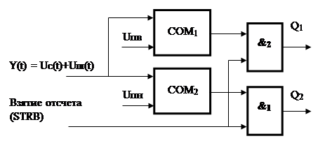 Структурная схема опознавателя представлена на рис.2.5. Здесь два пороговых (компаратора) устройства, у которых верхний пороговый уровень Uпв =0,6В, а нижний Uпн =0,3В. Правило принятия решений характеризуется следующими выражениями: