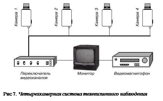 Ìàëîêàäðîâûå ñèñòåìû òåëåâèçèîííîãî íàáëþäåíèÿ ìîãóò âûïîëíÿòü îõðàííûå ôóíêöèè.Äîìîôîíû âûïîëíÿþòñÿ ïî äâóõïðîâîäíîé è ÷åòûðåõïðîâîäíîé ñõåìàì ñîåäèíåíèÿ áëîêà ìîíèòîðà è ïåðåãîâîðíîãî óñòðîéñòâà ñ êàìåðîé. Ïðåèìóùåñòâî äâóõïðîâîäíîé ñõåìû çàêëþ÷àåòñÿ â òîì, ÷òî äëÿ ñîåäèíåíèÿ ìîíèòîðà è ïåðåãîâîðíîãî óñòðîéñòâà ñ êàìåðîé ìîæåò èñïîëüçîâàòüñÿ îáû÷íûé òåëåôîííûé ïðîâîä. Îäíàêî, òàêàÿ ñõåìà ñîåäèíåíèÿ äîïóñêàåò òîëüêî øòàòíîå âêëþ÷åíèå äîìîôîíà. Ðàññòîÿíèå ìåæäó äîìîôîíîì è ïåðåãîâîðíûì óñòðîéñòâîì îãðàíè÷åíî ñîïðîòèâëåíèåì ñîåäèíèòåëüíîãî êàáåëÿ. Ïðè ÷åòûðåõïðîâîäíîé ñõåìå ñîåäèíåíèÿ âîçìîæíû êîìáèíàöèè âêëþ÷åíèÿ íåñêîëüêèõ äîìîôîíîâ è êàìåð, íåîãðàíè÷åííîå óâåëè÷åíèå ðàññòîÿíèÿ ìåæäó äîìîôîíîì è ïåðåãîâîðíûì óñòðîéñòâîì ñ êàìåðîé è ò. ä. ÒÐÀÄÈÖÈÎÍÍÛÅ ÑÈÑÒÅÌÛ ÒÅËÅÂÈÇÈÎÍÍÎÃÎ ÍÀÁËÞÄÅÍÈß Òðàäèöèîííûå ñèñòåìû òåëåâèçèîííîãî íàáëþäåíèÿ (â òîì ÷èñëå ñî ñêðûòûìè êàìåðàìè) ìîãóò ïðèìåíÿòüñÿ äëÿ øèðîêîãî ñïåêòðà îáúåêòîâ: îò êâàðòèð, îôèñîâ è äà÷ äî ñêëàäñêèõ ïîìåùåíèé, ìàãàçèíîâ, àâòîìîáèëüíûõ ñòîÿíîê è êàçèíî. Íà «ïðîñòûõ» îáúåêòàõ (íåáîëüøèå ìàãàçèíû, àâòîçàïðàâêè) óñòàíàâëèâàþòñÿ ñèñòåìû òåëåâèçèîííîãî íàáëþäåíèÿ âêëþ÷àþùèå íå áîëåå 4-õ òåëåâèçèîííûõ êàìåð, ìîíèòîð è ïðîñòûå ñðåäñòâà îáðàáîòêè âèäåîñèãíàëà. Òàêèå ñèñòåìû ïîçâîëÿþò îò÷åòëèâî ðàçëè÷àòü ìåëêèå ïðåäìåòû, íîìåðà àâòîìàøèí. Íà ðèñ.7 ïîêàçàíà ñõåìà ÷åòûðåõêàìåðíîé ñèñòåìû òåëåâèçèîííîãî íàáëþäåíèÿ. Êîììóòàòîð ïîçâîëÿåò íàáëþäàòü íà ýêðàíå ìîíèòîðà èçîáðàæåíèÿ: - â àâòîìàòè÷åñêîì ðåæèìå, ïîñëåäîâàòåëüíî îò êàæäîé êàìåðû, ñ âûáðàííîé ïåðèîäè÷íîñòüþ; - ëþáîé èç êàìåð, âûáðàííîé îïåðàòîðîì;