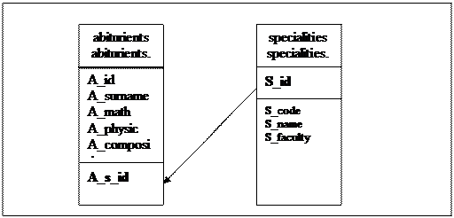 Рисунок 3 – Схема структуры базы данных В программе данного курсового проекта применен способ изменения значения поля, связанного с ключевым полем. Если попробовать связать главную таблицу с подчиненной с помощью конструктора связей, а потом попытаться изменить значение поля A_s_id, то вместо смены значения движок базы данных выдает ошибку о том, что рекурсивные ссылки не поддерживаются. Поэтому в других программах реализуются так называемые подстановочные таблицы. Разработанная программа обходит проблему рекурсивной ссылки без использования подстановочных таблиц. В программе нет никаких связей заданных по умолчанию. Вместо этого на форме находится DBLookupComboBox, который связал поля s_id и a_s_id и в то же время ссылается на поле s_id. Если эти поля связать между собой в конструкторе связей, база данных будет выдавать ошибку, поскольку BDE полагает, что поле s_id связано само с собой. А если не связать, то программа не будет отображать отдельно записи абитуриентов по разным специальностям, а будет отображать все подряд. Программой обрабатываются два события связанные с DBLookupComboBox. Это onEnter и onCloseUp. Когда пользователь начинает выбор специальности из списка, то происходит событие onEnter, программа выполняет программный разрыв связи между таблицами, и поэтому во время раскрытия списка в таблицах сетки отображаются все записи абитуриентов. Зато, благодаря отсутствию связи можно выбрать любую специальность из списка, а не только ту, абитуриенты которой отображаются в данный момент на экране (см. рис. 4).
