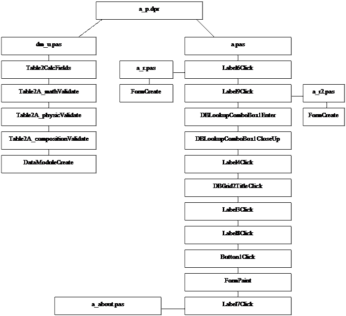 Рисунок 6. Иерархическая модель программы. Все функции программы реализованы при помощи свойств компонент Delphi и не требуют специального программного кода, описывающего алгоритм. Навигация по базе данных выполняется при помощи навигаторов баз данных. В случае возникновения исключительных ситуаций выводятся сообщения об ошибках, рекомендуемые действия пользователя и программа отменяет все изменения в таблице, выполненные до сохранения. В приведенной в приложении А схеме данных показан технологический процесс обработки данных. Данные из двух таблиц используются для выполнения выборок данных при помощи специальных sql запросов. Разработанная программа предназначена для ведения базы данных типа Paradox для учета движения товаров. Она содержит 2 связанных таблиц, 4 формы и один модуль данных. Все компоненты связанные с базой данных собраны в одном модуле данных DM. Текст модуля находится в файле dm_u.pas. Полный текст программы находится в приложении. Перечень файлов проекта: a.dcu a.dfm a.pas a_about.dcu a_about.dfm a_about.pas a_p.cfg a_p.dof a_p.dpr a_p.res a_r.dcu a_r.dfm a_r.pas a_r2.dcu a_r2.dfm a_r2.pas dm_u.dcu dm_u.dfm dm_u.dti dm_u.pas