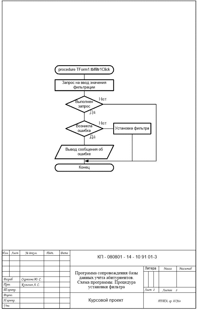 В данном курсовом проекте были выполнены все поставленные задачи в соответствии с техническим заданием. Определены состав и структура данных в виде 2-х связанных таблиц. Определены методы решения задач, разработаны SQL-запросы для выборки данных из БД, разработана программа в средстве разработки Borland Delphi. Описаны компоненты, использовавшиеся для разработки программы. Документированы возможности программы, разработано руководство пользователя. Литература 1. Вейскас Д. Эффективная работа с MicrosoftAccess 97. /Вейскас Д. – С-Пб.: Питер, 1999. 2. Калверт Ч. BorlandC++ Builder / Калверт Ч., Рейсдорф К. – М.: Нолидж, 1998. 3. Фаронов В.В. Система программирования Delphi / В.В. Фаронов – М.: Нолидж, 2002. 4. Фаронов В.В. Системное программирование / В.В. Фаронов – М.: Нолидж, 2003. 5. Inprise Corporation. Delphi Help. / Borland Press, 2000. Приложение А Схема данных Приложение Б Схема работы программы
