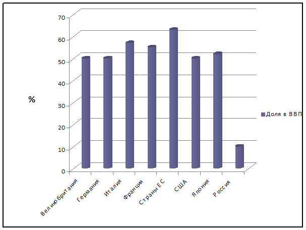 Как видно из Табл.1, развитие малого бизнеса в России существенно отстает в сравнении с рядом развитых стран. В составе важнейшего итогового показателя - ВВП доля малых и средних предприятий в России составляет лишь 10-11%, в то время как в развитых странах - 50-60%.