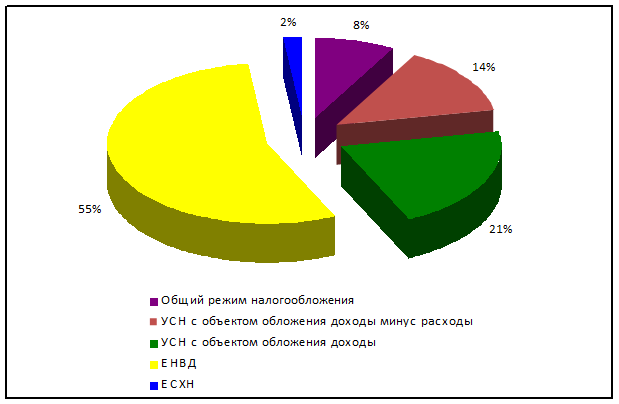 Рисунок 5. Доля малых сельскохозяйственных предприятий в общей доле малых предприятий в России в 2008 году Для снижения налоговой нагрузки малых предприятий были приняты специальные налоговые режимы: упрощенная система налогообложения, единый налог на вмененный доход и единый сельскохозяйственный налог, заменяющие уплату части налогов единым налогом. С введением данных единых налогов номинальная нагрузка на предприятие снижается, а доходы бюджетов должны расти за счет расширения налогооблагаемой базы. 1.2. Особенности применения специальных режимов налогообложения. В Налоговом кодексе РФ (часть первая, ст. 18) с 1 января 1999 года было введено понятие "специальный налоговый режим". Специальный налоговый режим создается в рамках специальной (и не обязательно льготной) системы налогообложения, для ограниченных категорий налогоплательщиков и видов деятельности, обязательно включающей в себя единый налог, как центральное звено, и сопутствующее ему ограниченное количество других налогов и сборов, заменить которые единым налогом либо нецелесообразно, либо просто невозможно. Специальный налоговый режим, по сравнению с общим режимом налогообложения, можно рассматривать в качестве особого механизма налогового регулирования определенных сфер деятельности. Специальный налоговый режим следует рассматривать с двух методологических позиций: как организационно-финансовую категорию управления объективными налоговыми отношениями и как особую форму (механизм) налогового регулирования. Как организационно-финансовая категория, специальный налоговый режим также имеет две субстанции: - с одной стороны, ее содержание составляет движение стоимости (объективные финансовые отношения) в налоговой форме; - с другой стороны, — это категория особой организации налогообложения, строящаяся на специальных принципах, и управления налоговым процессом в строго определенных сферах деятельности (субъективная сущность). Применение специальных налоговых режимов освобождает налогоплательщиков от уплаты большинства налогов, уплачиваемых при общей системе (налог на добавленную стоимость (НДС); налог на прибыль; налог на имущество; единый социальный налог), заменяя их единым налогом. Для предприятий малого бизнеса существует возможность выбора той или иной специальной системы налогообложения. Существует три системы.