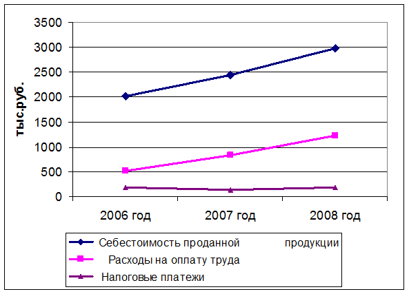 За анализируемые три года можно наблюдать, увеличение выручки от реализации на 50-60%, а увеличение себестоимости продукции всего лишь на 20%. Значительное повышение выручки в 2007 году, и увеличение всего лишь на 20% себестоимости, привело к начислению ЕСХН в 38319 рублей. Значительный рост выручки позволил увеличить оплату труда, и конечно же привел к получению прибыли предприятием в 2007 году, но не следует забывать, что специфика сельского хозяйства, количество и качество продукции во многом зависят от погодных условий. Так в 2008 году обьём выручки практически не изменился, а вот затраты на оплату труда выросли, что привело к увеличению расходов.