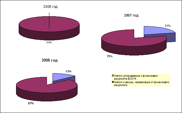 Рисунок 11. Доля уплаченных налогов, наяисляемых на финансовый результат Исходя из данной таблицы, можно сделать вывод, что основная налоговая нагрузка на предприятие, состоит из взносов и налогов, обязательных для уплаты, и независящих от размера прибыли предприятия. Доля единого сельскохозяйственного налога в общей сумме уплачиваемых налогов составила в 2007 году – 21%, в 2008 году – 13%, а в 2006 году ООО «Нива-2» не уплачивало налог, так как в этом году доходы были равны расходам, и финансовый результат равен нулю. Коэффициент эффективности налогообложения Кэн. Он показывает, как соотносятся между собой показатели чистой прибыли и общей суммы начисленных налоговых платежей организации. Расчет этого показателя осуществляется по формуле: Кэн = ЧП/Н, где ЧП – фактическая сумма чистой прибыли Н – общая сумма налоговых платежей. Кэн07 = 638653 / 185666 = 3,44 Кэн08 = 483979 / 217060 = 2,23 Коэффициент эффективности налогообложения за 2007 и 2008 год составил 3,44 и 2,23 соответственно. Это значит что, чистой прибыли в два раза больше чем начисленных налоговых обязательств. А в 2006 году коэффициент эффективности налогообложения невозможно рассчитать, из-за отсутствия прибыли в данном году. Коэффициенты налоговой нагрузки на выручку от продаж: Кнв =прямые налоги / выручка от продаж; Кнв06 = 114345 / 2602000 = 0,04 Кнв07 = 185666 / 4067000 = 0,05 Кнв08 = 217060 / 4879000 = 0,04 Данный коэффициент показывает сколько копеек налогов приходится на 1 рубль выручки. Чем меньше коэффициент налоговой нагрузки на выручку тем больше прибыли остается на предприятии. Из расчета за три года, можно сказать, что данный коэффициент остается на неизменном уровне в 2006 и 2008 году это 0,04, а в 2007 году он вырос и составил 0,05. Коэффициент налоговой нагрузки на прибыль предприятия: Кнп= ЕСХН / прибыль; Кнп06 = невозможно исчислить коэффициент, т.к. в этом году ЕСХН не уплачивался. Кнп07 = 38319 / 638653 = 0,06 Кнп08 = 29039 / 483979 = 0,06 Вывод: С помощью данных рассчитанных коэффициентов, мы видим сколько копеек налоговых платежей приходиться на 1 рубль выручки и прибыли. Также с помощью коэффициента эффективности налогообложения, мы наблюдаем, что прибыль у предприятия в 2-3 раза больше всех налоговых обязательств. Значительную налоговую нагрузку на выручку предприятия оказывают взносы в Пенсионный фонд Российской Федерации (примерно 50% от всех выплачиваемых налоговых обязательств), и за анализируемый период нагрузка растет. Это вызвано увеличением фонда оплаты труда. Однако коэффициент налоговой нагрузки на прибыль остается неизменным 0,06. Это означает, что начисление и выплата ЕСХН возрастает в прямой зависимости от прибыли предприятия. Выручка предприятия растет, оплата труда повышается, прямые налоги растут соразмерно прибыли предприятия, значит ООО «Нива-2» справляется с налоговыми обязательствами, и практически не имеет просроченной задолженности по налогам и сборам. 3. ПРЕДЛОЖЕНИЕ ПО МИНИМИЗАЦИИ НАЛОГОВОЙ НАГРУЗКИ ООО «НИВА-2» 3.1. Выбор оптимального режима налогообложения для ООО «Нива-2» Процедура определения оптимального налогового режима экономического субъекта является достаточно сложным и ответственным этапом налогового менеджмента, от результатов которого зависит структура и динамика последующих финансовых потоков, связанных с осуществлением налоговых выплат. Поэтому возникает острая необходимость в использовании эффективных 