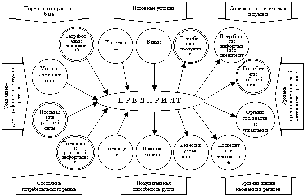 Прикладной анализ внешних для данного предприятия факторов риска целесообразно проводить в контексте общего описания его функционирования. На рис. 4 (приложение А) изображена обобщенная схема функционирования производственного предприятия в условиях реального или возможного взаимодействия с его основными экономическими контрагентами и средами. Эта схема отражает современные специфические российские реалии. Предприятие здесь представлено в виде узла скрещения (точки пересечения) финансовых, материальных, кадровых и информационных потоков, отражающих перемещение и потребление инвестиций, сырья, материалов, комплектующих изделий, оборудования, используемой и разрабатываемой технологии, денежных наличных и безналичных платежей, производимой продукции и действующих в условиях конкретной социально-экономической и природной среды. Свойства среды (на схеме широкие стрелки) касаются прежде всего погодно-климатических факторов; социально-демографической ситуации в регионе, которая определяет его трудоизбыточность или трудонедостаточность по различным категориям работников, а также региональный «имидж», престижность той или иной профессии или рода деятельности; социально-политических условий, от которых зависят обстановка в регионе, степень ориентации населения на производительный труд, уровень социальной напряженности; состояния потребительского рынка как фона для формирования региональных потребностей в продукции предприятия; уровня жизни населения как фактора платежного обеспечения этой потребности; покупательной способности рубля в текущем и тенденциальном выражении, определяющей динамику инфляции и инфляционных ожиданий; общего уровня предпринимательской активности, характеризующего склонность людей к включению в предпринимательские инициативы. Некоторые экономические субъекты изображены на схеме в виде кружков с двойной обводкой. Это отмечены так называемые зоны конкуренции, т.е. дислокации возможных точек соприкосновения предприятия с конкурирующими организациями. Эта конкуренция касается поставщиков исходных материалов и оборудования; потребителей продукции; получения инвестиций, займов, кредитов и участия в выгодных для предприятия инвестиционных проектах; привлечения квалифицированных кадров и оплаты их труда; технологического и информационного рынков. В принципе любой из потоков, связывающих предприятие с рыночной средой, может быть полностью или частично перекрыт по решению участников обмена, в том числе и вследствие добросовестной или недобросовестной конкуренции. При этом в качестве конкурентов следует рассматривать не только предприятия, производящие такую же продукцию, но и предприятия, использующие (возможно, по другому назначению) те же трудовые, материальные, финансовые и иные ресурсы, в том числе и предприятия из других отраслей, в особенности те, которые могут переключиться на выпуск продукции данной отрасли. (Заметим, что по мере развития рынка, роста конкуренции переход предприятия из одной отрасли в другую, более рентабельную, будет все более частым явлением). Таким образом, функционирование предприятия постоянно подвергается опасности срыва или ухудшения со стороны внешних для него факторов из-за возможного нарушения региональных, отраслевых и межотраслев