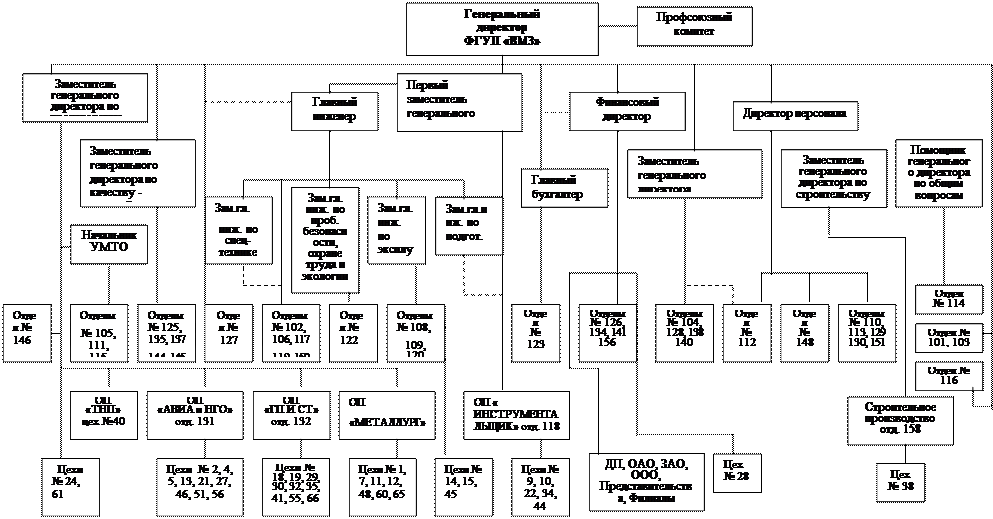 Как видно из таблицы 1.1 наибольший темп роста прослеживается в производстве нефтяного газового оборудования, который составляет 84,6 %. Это связано, прежде всего, с увеличением заказов от организаций и предприятий государственной и других форм собственности. Темп роста в производстве товаров народного потребления составил 84 %, что обусловлено выработанной на ФГУП «ВМЗ» стратегией по увеличению выпуска товаров народного потребления. Темп роста производства сторонней продукции составил 77,5 %, что обусловлено увеличением заказов от МПС и «Автозапчасть». Так как сторонняя продукция представляет собой законченный продукт, а не полуфабрикат для отдельных вспомогательных производств. Заметно увеличилось производство жидкостных ракетных двигателей, темп роста, которого составил 72,1 %. Это связано с увеличением заказов государственного характера. Самый малый темп роста 63,5 % составило производство продукции для авиации, что обусловлено снижением заказов государственного характера. В целом в 2003 году наблюдается увеличение производства продукции по сравнению с 2002 годом. Передовые методы организации и высокоэффективные технологии надёжно обеспечивают конструктивные преимущества изделий, выпускаемых на ВМЗ. Идей и проектов у ВМЗ много. Однако реализуются они далеко не все. В условиях переходного периода от одной экономической системы в другую, это и не возможно. Но предпринимать максимум усилий к этому необходимо. Из-за статуса предприятия, которое по-прежнему остаётся государственным, ВМЗ не имеет возможности привлечь западные инвестиции. Потому, что до сих пор не выработаны залоговые механизмы. Не отвечает наше общество и целому ряду других требований, возникающих во всём мире в связи с внедрением инвестиций за рубеж. А средства ВМЗ нужны, чтобы развиваться и поддерживать статус России как великой космической державы. Что касается долгов, то они есть перед ВМЗ и у нефтяников, и у газовиков. В ближайшее время планируется решить все вопросы, касающиеся кредитования и взаимозачета газом за ту продукцию, которую на сегодня ВМЗ произвел для РАО «Газпром», опираясь на предварительно заключенные договора. Перед коллективом ФГУП «ВМЗ» стоит великое множество задач, связанных с совершенствованием работы по управлению оборотными средствами предприятия. А так же по ускорению оборачиваемости оборотных активов и совершенствованию эффективности использования оборотных средств на предприятии. Для более масштабного представления о данном предприятии представим на рисунке 1.1 структуру управления ФГУП «ВМЗ».