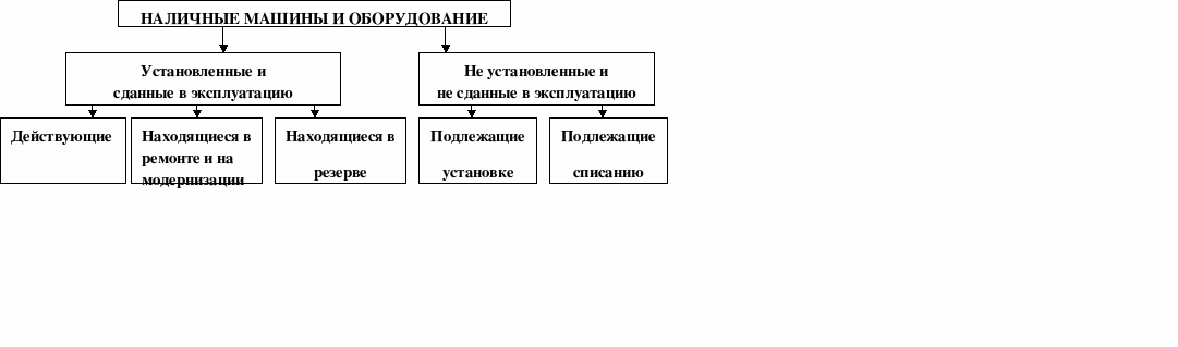Оборудование можно подразделить на наличное, установленное и действующее. К наличному относится все имеющееся в организации оборудование, не зависимо от того, где оно находится (в цехах, на складе) и в каком состоянии. К установленному относится смонтированное и подготовленное к работе оборудование, находящееся в цехах, причем часть установленного оборудования может быть в резерве, на консервации, в плановом ремонте, модернизации. Действующее оборудование - это фактически работающее в отчетном периоде оборудование независимо от продолжительности (Рис.1.1).