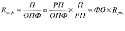 Согласно таблицы 2.10 фондоотдача сократилась на 0,41, вызвано это непропорциональным увеличением стоимости основных средств и объемов производства. Определим влияния факторов первого порядка на изменение фондоотдачи методом цепных подстановок: ФО ОПФ = ВП ОПФ Первая постановка: Изменение фондоотдачи за счет изменения объемов производства ∆ФО ОПФ∆ВП = ВП1 = 14695/4862 = 3,022 (3,022-2,95 = 0,072) ОПФ0 Изменение фондоотдачи за счет изменения стоимости основных производственных фондов: ∆ФО ОПФ∆ОПФ = ВП1 = 14695/5787 = 2,54 (2,54-3,022 = -0,482) ОПФ1 Баланс отклонений: 0,072-0,482 = - 0,41 ∆ФО ОПФ = 2,54-2,95 = -0,41 Согласно расчетам, увеличение объемов производства на 350 тыс.руб. повлияло на увеличение фондоотдачи на 0,072, но увеличение стоимости основных средств привело к сокращению фондоотдачи на 0,482. Определим влияние на изменение эффективности использования основных производственных фондов фондоотдачи активной части и структуры основных средств (факторов второго порядка). ФО ОПФ = ФО активной части ОПФ*Удельный вес активной части ОПФ. Способом абсолютных разниц определим влияние факторов: Удельный вес активной части ОПФ = (0,3055-0,4042)*7,3 = -0,72051 ФО активной части ОПФ = 0,3055*(8,3-7,3)= +0,3055 Баланс отклонений = -0,721+0,3055 = - 0,41 ∆ФО ОПФ = 2,54-2,95 = -0,41 Таким образом, уменьшение активной части основных фондов привело к сокращению фондоотдачи на 0,721, а увеличение фондоотдачи активной части повлекло увеличение фондоотдачи основных средств на 0,3055. Определим влияние отдельных факторов на изменение объема выпуска продукции (факторов третьего порядка). Выпуск продукции = ФО ОПФ*ОПФ Выпуск продукции = ФО ОПФ активной части*Активную часть ОПФ Выпуск продукции = ОПФ*удельный вес активной части ОПФ*ФО ОПФ активной части. Изменение выпуска продукции за счет стоимости ОПФ = (5787-4862)*0,4042*7,3 = +2730 Изменение выпуска продукции за счет изменения удельного веса активной части = 5787*(0,3055-0,4042)*7,3 = -4167,15 Изменение выпуска продукции за счет фондоотдачи активной части ОПФ = 5787*0,3055*(8,3-7,3) = +1768 Баланс отклонений: 2730-4167+1768 = 331 (погрешность 19 тыс.руб.) Из проведенных расчетов следует: Фондоотдача ОПФ уменьшилась в отчетном году по сравнению с предыдущим на 0,41 под влиянием следующих факторов: - стоимости ОПФ на -0,482; - объема производства на +0,072; -удельного веса активной части ОПФ на -0,72051; - фондоотдачи активной части на + 0,3055. 2. выпуск продукции увеличился в отчетном году по сравнению с предыдущим годом на 350 тыс.руб. под влиянием следующих факторов: - стоимости ОПФ на +2730 тыс.руб.; - удельного веса активной части ОПФ на -4167,15 тыс.руб.; - фондоотдачи активной части ОПФ на +1768 тыс.руб. Наиболее обобщающим показателем эффективности использования основных средств является фондорентабельность (таблица 2.11). Таблица 2.11 Данные для анализа фондорентабельности.