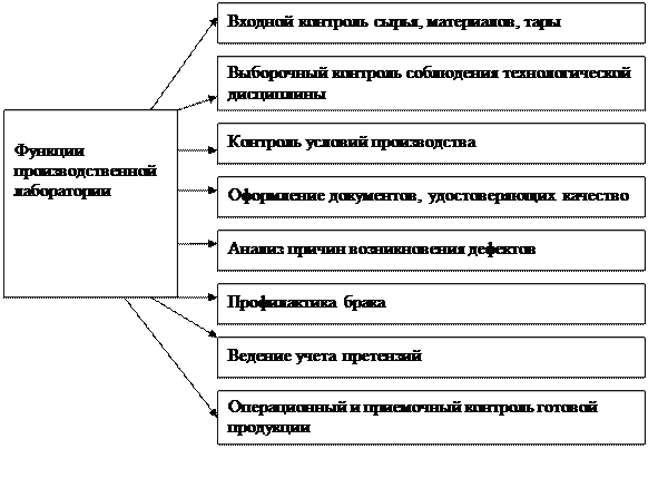 Рисунок 2.2 - Схема организации структуры производственной лаборатории Производственную лабораторию возглавляет заведующий производством, в непосредственном подчинении которого находятся инженер — технолог и техник — технолог. Заведующий производством организует деятельность лаборатории, обеспечивает подбор и расстановку кадров, принимает окончательное решение о приемке готовой продукции или об отнесении ее к браку. Основные цели производственной лаборатории следующие: снижение уровня брака и повышение качества продукции. Основная задача производственной лаборатории сводится к предотвращению выпуска некачественной продукции Задачи производственной лаборатории: 1)предотвращение выпуска продукции, не соответствующей требованиям стандарта, технологической документации; 2) укрепление технологической дисциплины и повышение ответственности за качество; 3) обеспечения проведения и совершенствования технохимического и микробиологического контроля, внутрипроизводственной стандартизации. Рассмотрим функции производственной лаборатории более подробно (данные представлены на рисунке 2.3).