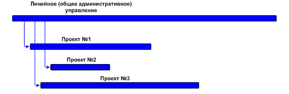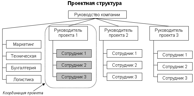 Проектная структура полностью противоположна матричной по своей организации. Здесь проектные команды как бы образуют свои собственные временные подразделения, созданные на время выполнения проекта и возглавляемые руководителями проектов. При такой организации функциональные подразделения выполняют сервисную функцию по отношению к проектам, т. е. оказывают им услуги, например техническую поддержку или бухгалтерское обслуживание. Также функциональные отделы играют роль пула ресурсов (например, специалистов), динамически перераспределяемых между проектами. В проектной структуре члены команды ориентированы только на достижение целей проекта и подчиняются только его руководителю. При такой организации проект фактически представляет собой филиал компании, при этом «законы», по которым действует сотрудник в рамках проекта, полностью определяются руководством проекта. Такая структура эффективна в крупных, значимых для компании проектах, как правило, продолжительностью более двух лет.