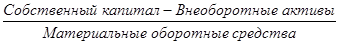 6. Коэффициент обеспеченности собственными оборотными средствами запасов и затрат (материальных оборотных средств) - рассчитывается как отношение собственных средств в обороте к материальным оборотным средствам и показывает, какая часть материальных оборотных средств сформирована за счет собственных источников: