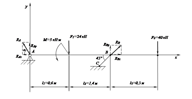 Зададимся системой координат с центром в точке А. Обозначим реакцию стержня ВС в точке В вектором RB , направление же реакции шарнира А не известно. Составим уравнение моментов в точке А: ΣМА = 0 ΣМА =МА (F1 )+ МА (F2 ) - МА (RB )+ МА (RA ) + M=0 Заметим, что момент реакции шарнира в точке А будет равен нулю, так как плечо l=0 МА (F1 )= F1 ∙ l1 =24 ∙ 0,6 = 14,4 кН∙м МА (F2 )= F2 ∙ (l1 + l2 +l3 )= 40 ∙ 2,5 = 100 кН∙м МА (RA )= 0 кН∙м М = - 3 кН∙м получаем уравнение: 14,4 + 100 - 3 - МА (RB ) = 0 - МА (RB ) = - 14,4 - 100 + 3 - МА (RB ) = - 111,4 кН∙м МА (RB ) = 111,4 кН∙м Найдем реакцию RB : МА (RB ) = RB ∙ cos 45º · (l1 + l2 ) RB