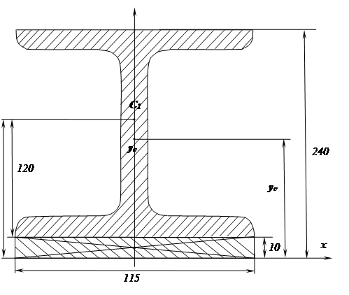 ![]() А1 = 34,8 см2 = 3480 мм2 А2 = 115 ∙ 10 = 1150 мм2 y1 = 130 x1 = 0 y2 = 10 : 2 = 5 x2 = 0 Так как сечение симметрично относительно оси yдостаточно определить только координату yс yс