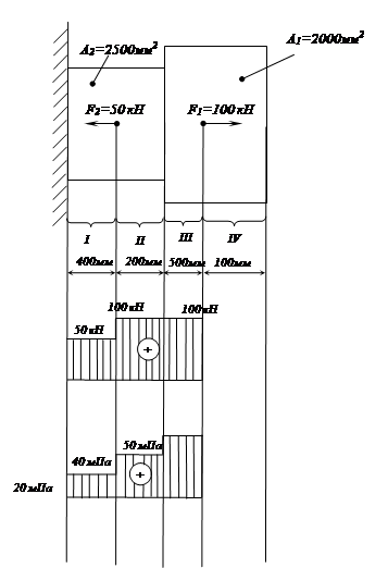 Участок I – не деформируется и продольные силы в нем будут равны нулю. N1 = 0 N2 = N3 = 100 кН N4 = F1 – F2 = 100 – 50 = 50 кН т.е. на всех участках брус растянут, а продольные силы будут равны: на участках II и III – 100 кН на участке IV – 50 кН Чтобы определить нормальные напряжения в поперечных сечениях бруса нужно разделить значения продольных сил на площади сечений. для участка II : σII
