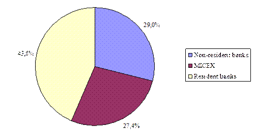 Валютные форварды и деривативы заключаются российскими банками в основном внутри страны или on-shore: контрагентами по данным сделкам являются банки-резиденты — 43,6% и ММВБ — 27,4%, тогда как доля трансграничных сделок с банками-нерезидентами составляет чуть менее 1/3 — 29% (рис. 2). Банки-нерезиденты располагаются в основном в Европе (главным образом в Лондоне) — 87%, в Северной Америке — 10% и почти 3% — в Азии (Токио, Сингапур и Гонконг).