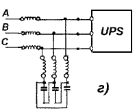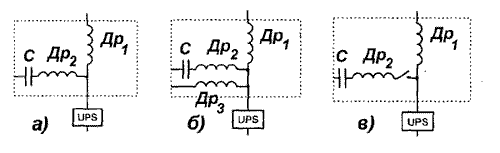 Нескомпенсированный фильтр содержит продольную индуктивность Др1 и поперечную цепь, состоящую из последовательно включенных индуктивности Др2 и емкости С, настроенных на определенную гармонику (рис. 2а). Если фильтр настроен на 5-ую гармонику, то сопротивление поперечной цепи близко к нулю и ток, потребляемый от источника, не будет содержать эту гармонику. Недостатком такого фильтра является следующее. При использовании в качестве первичного источника питания дизель-генераторную установку (ДГУ) с ограниченной установочной мощностью, последний может обеспечить относительно низкое значение емкостной составляющей тока нагрузки (10-30%). При включении UPS на ДГУ, когда осуществляется "мягкий" старт выпрямителя, активная мощность, потребляемая нагрузкой, равна нулю и генератор ДГУ оказывается нагруженным только на емкостное сопротивление фильтра. Значительная емкостная составляющая потребляемого от генератора тока может привести к нарушению нормальной работы генераторной системы и отключению ДГУ. Следовательно, возможность использования нескомпенсированных LC-фильтров должна быть проанализирована с точки зрения согласования характеристик генератора и параметров фильтра. Скомпенсированный фильтр содержит дополнительную поперечную индуктивность Др3, способствующую тому, что фильтр по отношению к генератору имеет индуктивный характер (рис. 2б). Это снижает емкостную составляющую потребляемого тока и облегчает работу генератора в пусковом и установившемся режимах. Однако наличие Др3 приводит к снижению коэффициента мощности системы в целом. Нескомпенсированный фильтр с коммутатором удобен при использовании ДГУ ограниченной мощности, соизмеримой с мощностью UPS. Поперечная цепь фильтра подключается автоматически только после выхода UPS на номинальный режим (рис. 2в). Таким образом, не требуется применение ДГУ завышенной мощности и не снижается коэффициент мощности системы. 3. Применение специальных разделительных трансформаторов.Разделительный трансформатор с обмотками "треугольник-звезда" позволяет эффективно бороться с гармониками, кратными третьей, при сбалансированной нагрузке. Для ослабления влияния несимметрии нагрузки и уменьшения тока нейтрали применяют зигзагообразную систему обмоток, где вторичная обмотка каждой фазы разбита на две части и размещена на разных стержнях магнитопровода трансформатора. 4. Применение магнитных синтезаторов.Магнитный синтезатор обеспечивает защиту нагрузки от различных искажений электропитания, в частности, от провалов и выбросов напряжения, импульсных и высокочастотных помех, наличия высших гармоник, вызывающих искажения синусоидальной формы входного напряжения. Выходное напряжение магнитного синтезатора на каждом полупериоде основной частоты генерируется путем объединения шести прямоугольных импульсов от связанных между собой трансформаторов с насыщением, аналогично инверторам со ступенчатым (пошаговым) принципом управления. Однако магнитный синтезатор не содержит каких-либо силовых полупроводниковых элементов, выполняя функцию стабилизатора напряжения.