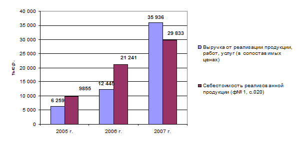 В таблице 1.1 собраны основные показатели деятельности ООО «Универсал» за период 2005-2007 гг. В качестве источника информации использовалась годовая бухгалтерская отчетность предприятия. В течение анализируемого периода наблюдался рост выручки от реализации продукции, связанный с наращиванием масштабов деятельности предприятия, расширением сбытовой сети путем увлечения числа магазинов. Объем реализации в сопоставимых ценах за 2005 – 2007 гг. в целом возрос на 474 %, при этом темп роста в 2006 гг. составил 199 % по сравнению с 2005 г. Динамику выручкиот реализации и себестоимости продукции ООО «Универсал» за 2005-2007 гг. можно проследить по диаграмме, представленной на рис. 1.9.