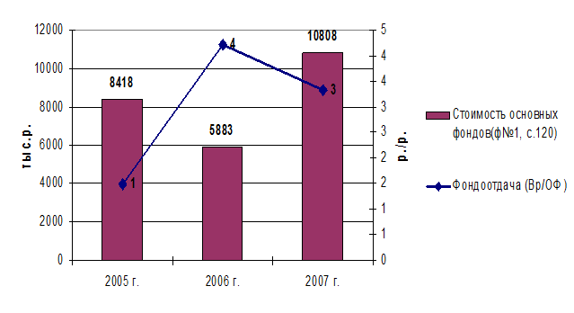 Рис. 1.13. Динамика заработной платы и выработки работников ООО «Универсал» за 2005-2007 гг. Одним из основных элементов, обеспечивающих возможность производственной деятельность, являются производственные фонды предприятия. Следует отметить умеренную деятельность предприятия, направленную на наращивание производственной базы – стоимость основных фондов за 2005 – 2007 гг. возросла на 28% и составила 10808 тыс. р. к концу 2007 г. Такой рост стоимости фондов характеризует рост значения фондоотдачи с уровня 1р./р. в 2005 г. до уровня 3 р./р. в 2007 г. Динамика фондоотдачи и стоимости основных фондов изображена на рис. 1.14.