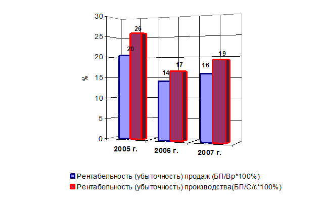 Рис. 1.15. Динамика показателей прибыли ООО «Универсал» за 2005-2007 гг. Согласно данным рис.1.15 можно отметить положительную динамику в росте балансовой и чистой прибыли. Так, в за 2005-2007 гг. балансовая прибыль выросла на 124%, а чистая – на 125%. Динамика показателей рентабельности ООО «Универсал» за 2005-2007 гг. представлена на рис.1.16. Анализируя показатели рентабельности мы выявили отрицательную динамику. Рентабельность продаж показывает величину чистого дохода, полученного предприятием на рубль проданной продукции. Рентабельность продаж предприятия за 2005- 2007 гг. упала на 22% и составила 16%. Рентабельность производства за 2005-2007 гг. упала на 26% и составила 19%.