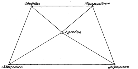 Рис 1. Схема триангуляции 2-го разряда В таблице 1 представлены координаты опорного пункта «Марьино» и результаты полевых измерений длины исходной стороны и ее направления (α). Таблица 1
