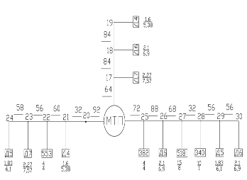 Зная расчётную нагрузку на участках линии, уточним суммарную нагрузку на шинах ТП. Она получается путём суммирования расчётных нагрузок отходящих от ТП линий (для ТП1 участки ТП1-2, ТП1-3, ТП1-11; для ТП2 участки ТП2-17, ТП2-20, ТП2-25). ТП1: