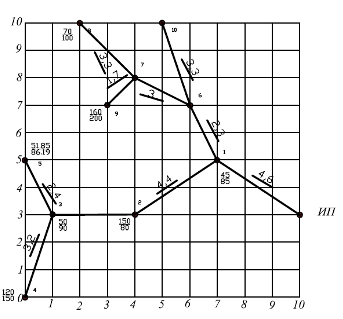 Рис. 3. Расчётная схема линии 10 кВ4.1 Определение расчетных нагрузокРасчетные максимальные нагрузки (отдельно – дневные и вечерние) участков сети определяются по сумме расчетных мощностей населенных пунктов, расположенных за этим участком, по следующей формуле: Pр = Pнаиб. + SDР, (4.1) где Рр – расчетное значение максимальной мощность, кВт; Рнаиб. – наибольшее значение мощности, кВт; SDР – сумма надбавок (таблица 3.10 [3]), кВт. Пользуясь расчетной схемой высоковольтной сети определяем максимальные нагрузки. Расчеты сводим в таблицу 4.1. Таблица 4.1 Расчет максимальных нагрузок сети 10кВ.