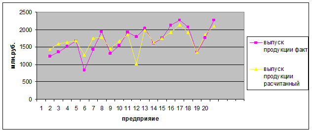 Коэффициент корреляции находим через статистическую функцию «Коррел», коэффициент A – через функцию «Отрезок», коэффициент B – через функцию «Наклон». Коэффициент B показывает, что выпуск продукции предприятий увеличивается на 510,91 млн. руб, . При увеличении стоимости ОПФ на 1 млн. руб.