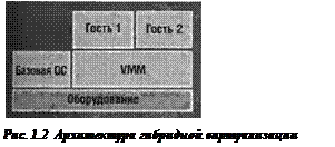 Рис. 1.6 Полная виртуализация 1.4 Аппаратная виртуализацияДля преодоления проблем с виртуализацией процессорных ресурсов, компании Intel и AMD ввели в свои новые процессоры новый режим процессора - так называемый "гостевой" режим. Благодаря этому, гостевой операционной системе на аппаратном уровне предоставлялась возможность выполнять привилегированные команды в нулевом кольце процессора. Это значительно повысило производительность решений на базе виртуализации, ведь теперь гипервизору не нужно было выполнять ресурсозатратные действия по контролю за кодом гостевой ОС. Конечно, гипервизор сохранился, но большое количество его функций с введением аппаратной виртуализации просто исчезли. Технологии аппаратной виртуализации фирм Intel и AMD называются соответственно Intel VT и AMD SVM. Наличие или отсутствие поддержки аппаратной виртуализации является одним из пунктов описания любого современного процессора. Стоит отметить, что далеко не все новые процессоры поддерживают аппаратную виртуализацию. К примеру, популярный процессор Intel Q6600 поддерживает технологию Intel VT, а Q8200 - нет. Кроме технологий аппаратной виртуализации процессорных ресурсов, технологии аппаратной виртуализации сделали возможным прямой доступ гостевых операционных систем к аппаратным устройствам, к примеру, жестким дискам, напрямую через канал DMA. Однако из-за этого уменьшается количество устройств, которые можно назначить гостевой ОС, и ухудшается её переносимость .