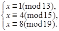 . Так как модули 13, 15, 19 попарно взаимно простые числа, то данная система имеет единственное решение по модулю