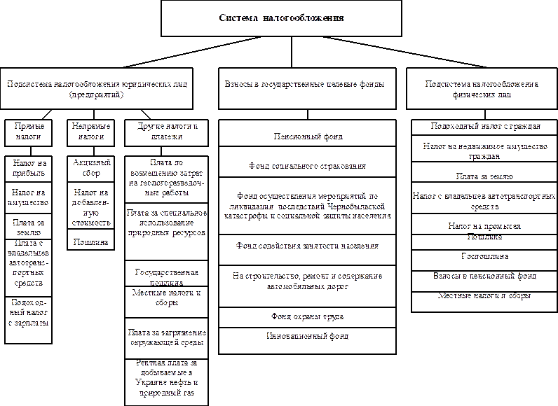 Рис.1.Виды налогов Банки и другие кредитные учреждения, осуществляющие свою деятельность на коммерческих началах, уплачивают в бюджет подоходный налог. Система подоходного обложения распространятся также на страховые организации, получающие доходы от страховых видов деятельности. Наличие разных форм собственности, экономическое соперничество вызывает необходимость взимания налога не только с получаемых доходов, но и со стоимости имущества, которое прямым или косвенным образом способствует росту дохода предприятия. Поэтому налог на имущество предприятий - неотъемлемая часть налоговой системы страны при рыночных отношениях. Он введен для субъектов хозяйствования, являющихся собственниками имущества на территории государства. При его взимании реализуются и фискальная, и экономическая функции налога. Первая - благодаря тому, что налог на имущество обеспечивает стабильные поступления в доходы территориальных бюджетов, так как вносится в первоочередном порядке с отнесением расходов по его уплате на себестоимость продукции; вторая – через заинтересованность предприятия в уплате меньших сумм, чем стимулируется стремление плательщика быстрее освобождается от излишнего, неиспользуемого имущества. Важное место в налоговой системе страны занимают платежи за природные ресурсы: земельный налог, плата за воду, лесной доход и другие. Одни из них вносятся из прибыли, другие - за счет себестоимости. Значение названных платежей в том, что они играют не только фискальную, но и стимулирующую функцию, ориентируя субъектов хозяйствования на более эффективное использование соответствующих видов ресурсов. Необходимость в подобном стимулировании вызвана возросшими масштабами общественного производства, требующими вовлечения в хозяйственный оборот все новых и новых ресурсов. Между тем последние далеко не безграничны и в силу относительного уменьшения становятся все дороже. Одним из самых ценных природных богатств является земля. Однако эффективность её использования не была объектом пристального внимания, так как земля была бесплатной для основных её потребителей - субъектов хозяйственной деятельности. Утрата хозяйственных угодий, разбазаривание земельных массивов при строительстве дорог и сооружении промышленных объектов, нерациональные жилищные и административные застройки в городах - все это было логическим следствием бесплатности земли. За владение, распоряжение и пользование землей в городской и сельской местности уплачивается земельный налог (за аренду земли - арендная плата). В составе налогов взимаемых за природные ресурсы, важную роль играет плата за воду. Её вносят промышленные предприятия, использующие воду для производственных целей. Исчисляется эта плата по ставкам, устанавливаемым за один кубический метр забираемой воды, и относится на себестоимость продукции. При определении ставок учитываются затраты государства на воспроизводство водных ресурсов. Если потребление воды превышает технически установленные нормативы, ставка платы за воду повышается. В интересах охраны водной среды государство использует также штрафы за сброс неочищенных или недостаточно очищенных вод. Переход на рыночные условия хозяйствования, более полная реализация принципа самоокупаемости произведенных затрат выдвига