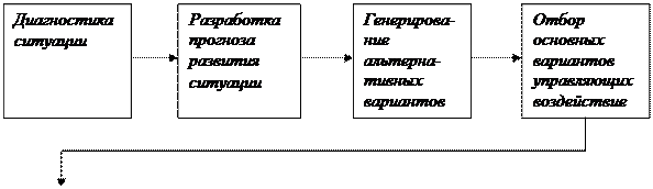Первый блок этапов разработки управленческого решения включает 6 : Получение информации о ситуации. Для адекватного представления ситуации и принятии управленческих решений лицом, принимающим решения (ЛПР), как правило, используются не только количественные данные, но и данные качественного характера. Это обеспечивается с помощью широко используемых в процессе принятия решений экспертных технологий. Получаемая информация о ситуации принятия решения должна быть достоверной и достаточно полной. Недостоверная либо недостаточно полная информация может приводить к принятию ошибочных и неэффективных решений. Однако не меньшие трудности возникают и при наличии избыточной информации, поскольку возникает проблема отбора информации, действительно представляющей интерес и важной для своевременного принятия эффективного управленческого решения. Целесообразной при получении и обработке информации о ситуации принятия решения является подготовка аналитического материала, отражающего основные особенности и тенденции развития ситуации. Определение цели. Большое значение имеет определение целей, стоящих перед организацией. Только после их определения можно осуществлять определение факторов, механизмов, закономерностей, влияющих на развитие ситуации. Четкое определение цели является неотъемлемой составляющей процесса управления, большое значение, а также имеет определение приоритетности целей, поскольку опыт показывает, что при реальном управлении приходится осуществлять выбор. Важно при определении целей организации четко представлять возможные пути их достижения. Формирование целей организации может осуществляться непосредственно руководителем, а может вырабатываться коллективно советом директоров, ведущими менеджерами и т. д. В настоящее время разработаны методы построения результирующих деревьев целей и деревьев критериев, получаемых в результате коллективной экспертизы для тех случаев, когда точки зрения специалистов, формирующих цели организации, могут различаться. Разработка оценочной системы. В процессе выработки управленческого решения большое значение имеет адекватная оценка ситуации, различных ее аспектов, учитывать которые необходимо при принятии решений, приводящих к успеху. Для адекватной оценки того или иного аспекта ситуации нередко оказывается целесообразным формирование индексов, или индикаторов, характеризующих состояние ситуации в зависимости от изменения значений факторов, определяющих ее развитие. Например, индекс (индикатор) Доу-Джонса — индекс акций, позволяющий оценить движение биржевых ресурсов, характеризует состояние активности на бирже. Оценочная система формируется как для индивидуальных, так и для коллективных сравнительных оценок. В состав оценочной системы входят: критерии, характеризующие объект оценки; шкалы, с использованием которых оценивается объект по каждому из критериев; принципы выбора, по которым на основании оценок значений критериев для объекта определяется общая оценка либо производится сравнительная оценка предпочтительности альтернативных вариантов. Анализ ситуации. Основной задачей анализа ситуации является выявление факторов, определяющих динамику ее развития. Сначала проводится содержательный анализ и на качественном уровне устан