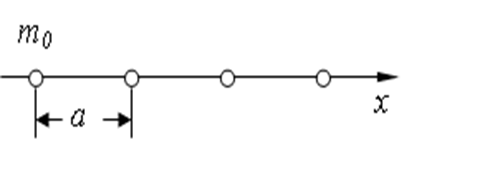 Рисунок 1.Однородная линейная цепочка атомов m0 – масса атома. а – расстояние между атомами. Закономерности, полученные для такой схематической одномерной модели, оправдываются и для трехмерных решеток. Кроме того, при достаточно высоких температурах движение атомов в кристалле действительно подчиняется законам классической механики. Допустим, что вдоль цепочки распределяется продольная волна. Рассмотрим мгновенную фотографию расположения атомов. И так рассмотрим линейную цепочку из одинаковых атомов с массами m