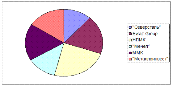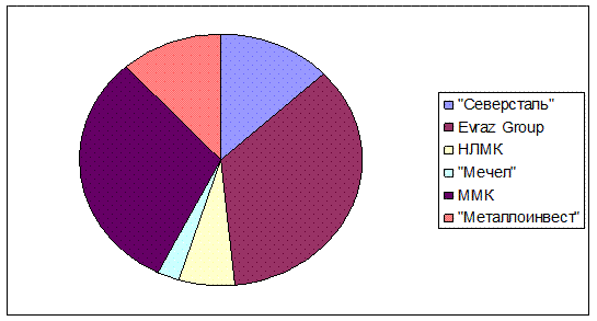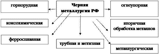 Рис. 2.1 Структура отрасли черная металлургия. Черная металлургия России отличается массовостью и высокой концентрацией производства, огромными масштабами использования сырья, топлива и вспомогательных материалов, тесным взаимодействием всех звеньев металлургического передела и его смежников, широкой утилизацией промышленных отходов. Эти технико-экономические особенности оказывают сильное влияние на территориальную организацию черной металлургии: освоение соответствующих по размерам сырьевых и топливных баз, выбор наиболее эффективных с точки зрения использования природных, трудовых и материальных ресурсов, вариантов размещения предприятий, установление определенных пространственных сочетаний металлургического производства с другими отраслями промышленности. Металлургические комбинаты, производящие чугун и сталь из руды, традиционно располагались около месторождений железных руд в районах, богатых лесом, так как для восстановления железа использовали древесный уголь. И в настоящее время металлургические комбинаты металлургической отрасли России расположены вблизи месторождений железной руды: Новолипецкий и Оскольский — около месторождений центральной России, Череповецкий («Северсталь») — около Карельского и Костомукшского, Магнитогорский — около горы Магнитная (уже выработанное месторождение) и в 300 км от Соколовско-Сарбайского в Казахстане, бывший Орско-Халиловский комбинат (в настоящее время «Уральская сталь») около месторождений природнолегированных руд, Нижнетагильский — вблизи Качканарского ГОКа, Новокузнецкий и Западно-Сибирский — около месторождений Кузбасса. Все комбинаты России расположены в местах, где ещё в XVIII веке и ранее существовало производство железа и изделий из него с использованием древесного угля. Месторождения коксующегося угля расположены чаще всего вдали от комбинатов именно по этой причине. Только НКМК и Запсиб расположены непосредственно на месторождениях каменного угля Кузбасса. «Северсталь» снабжается углём, добываемым в Печорском угольном бассейне. В центральной части России большая часть железорудного сырья добывается в районе Курской аномалии. В промышленных масштабах железорудное сырьё производится также на Карельском полуострове и на Урале, а также в Сибири (добыча ведётся в Кузбассе, Красноярском крае, Хакасии и близких им районах). Большие запасы железной руды в Восточной Сибири практически не осваиваются из-за отсутствия инфраструктуры (железных дорог для вывоза сырья). Два основных района производства коксующегося угля в России — Печорский (Воркута) и Кузнецкий бассейн (Кузбасс). Крупные угольные поля есть также в Восточной Сибири; они отчасти разрабатываются, однако промышленное их освоение упирается в отсутствие транспортной инфраструктуры. Центральная часть России, в частности Орел, Белгород, Воронеж, Тула не богаты металлами, поэтому в основном для внутренних нужд все сырье привозится из других регионов. Крупнейшими поставщиками металла в центральный регион являются общероссийские компании, такие как Импром, и местный, такие как ПРОТЭК и Союзметаллкомплект. При строительстве всех крупных металлургических комбинатов России (в советское время) одновременно велось и строительство ориентированного на каждый завод горно-обогатительного