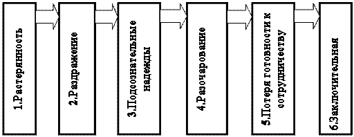Процесс потери интереса к труду можно рассмотреть как состоящий из шести стадий (Рис.2.1). Рис.2.1 Стадии потери интереса работника к труду При растерянности замечаются симптомы стрессового состояния, которое начинает испытывать новый работник. Работник перестает понимать, что ему нужно делать и почему работа у него не ладится. Он задает себе вопрос о том связано ли это с ним самим, с начальником или с работой. Нервные усилия работника пока не сказываются на производительности. Он легко контактирует с сослуживцами, а иногда даже пытается справиться с трудностями за счет более интенсивной работы, что в свою очередь может только усилить стресс. Разноречивые указания руководителя, неопределенность ситуации вскоре вызывают раздражение работника, связанное с ощущением собственного бессилия. Поведение работника приобретает демонстративные черты. Он подчеркивает свое недовольство в сочетании с повышенной производительностью. Тут он преследует две цели - зарекомендовать себя с лучшей стороны, а так же подчеркнуть на своем фоне бездеятельность руководства. На третьей стадии подчиненный перестает сомневаться в том, кто виноват в возникших у него трудностях. Теперь он надеется на промах начальника, после которого можно аргументировано доказать правильность своей точки зрения. Это выражается в утаивании служебной информации, необходимой для решения задач данного подразделения. Подчиненный начинает избегать начальника. Производительность и качество труда остаются в норме. На стадии разочарования восстановить подорванный интерес к работе гораздо труднее. Производительность труда снижается до минимально допустимой. Но на этой стадии работник еще не потерял последней надежды. Его поведение напоминает маленького ребенка, он полагает, что если будет “вести себя плохо”, начальник обратит на него внимание. В этот период страдают такие чувства работника, как уверенность в уважении со стороны подчиненных, сознание своего авторитета, привычка к хорошему отношению со стороны других сотрудников. Симптомом стадии потери готовности к сотрудничеству является подчеркивание работником границы своих обязанностей, сужение их до минимума. Некоторые начинают вызывающе пренебрегать работой, а то и вымещать дурное расположение духа на коллегах, находя удовлетворение в унижении других. Суть этой стадии - не борьба за сохранение интереса к работе, а попытка сохранить самоуважение. Окончательно разочаровавшись в своей работе (стадия 6), сотрудник перейдет на другое место, либо будет относиться к работе как к каторге. Один такой работник может сыграть в группе роль катализатора, привести к выплеску скрытого чувства недовольства всего коллектива. Получение нового места работы, а так же изменение привычных условий деятельности стимулирует работника, вызывает в нем желание проявить себя с лучшей стороны. Не получив возможности почувствовать себя необходимым, самостоятельным работником, которому доверяют и которого уважают, он разочаровывается в своей работе. Отвечая на этот вопрос «какой должна быть идеальная работа для подчиненных?», не следует стремиться к чрезмерной специфичности и оригинальности. Все равно учесть различие во вкусах и личных мнениях каждого удается редко, поэтому руководитель, как правило, стремится к повышению инте