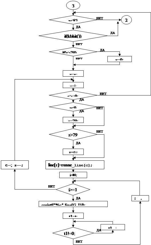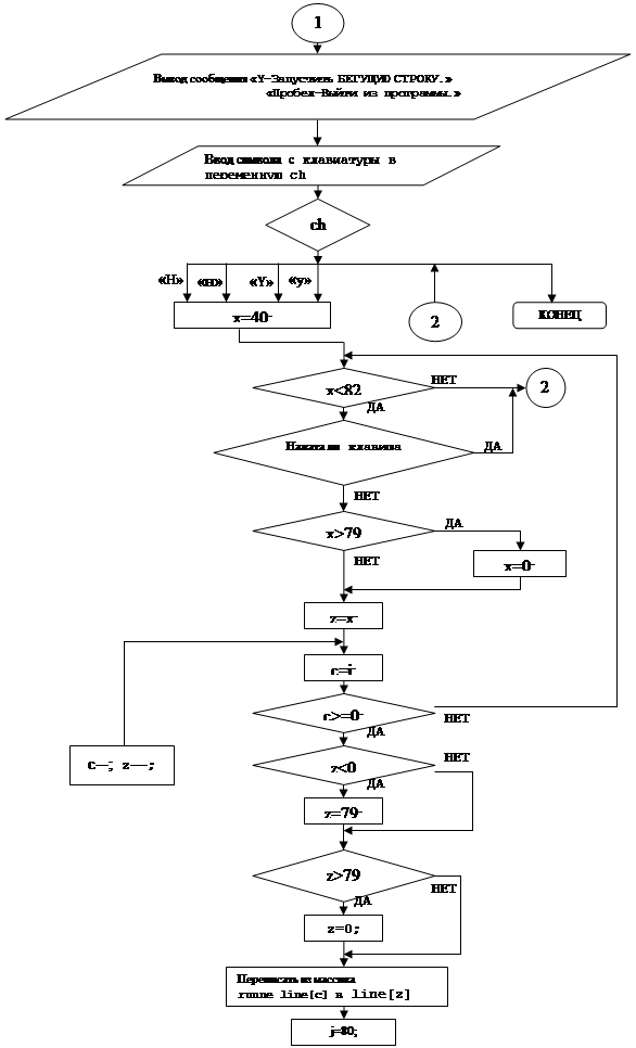 8. 1 char ch,runne_line[41]=" 1234567890123456789012345678901234567890"; Пробел необходим, для того, чтобы затереть первый символ бегущей строки в массиве line, остающийся при смещении её на знакоместо вправо. 1234567890… в процессе отладки видно где какое знакоместо. В принципе можно убрать, но и так не мешает. Эту строку можно заменить на следующее: char ch,runne_line[41], runne_line[0]=’ ‘: 2 Посимвольный ввод организовал по следующим причинам. Подсчет количества символов в бегущей строке. Необходим для того чтобы не делать лишних циклов при перезаписи из runne_line в line. Можно воспользоваться strlen (s), но тогда нужно #include<string.h> , что увеличит объем занимаемой памяти. К тому же функция strlen (s) не учитывает пробелы (пробел – ограничитель длинны строки). Поэтому невозможно организовать бегущую строку из двух и более слов. Посимвольный вывод для того чтобы обеспечить плавность сдвига строки. Без посимвольного ввода программа выглядит так: /*Программа БЕГУЩАЯ СТРОКА*/ #include <conio.h> #include <stdio.h> #include <string.h> main() { char ch,runne_line[41]; char line[80]=" "; int i,x=40,c,z,j; long int t1,t=232000; /*i,c - количество символов в строке *x,z - указатель на элемент массивов line и runne_line *t,t1 -задержка времени в тиках.*/ clrscr(); printf("\n\t\tВведите заданную строку.\n"); printf("\tСтроку, не более 40 символов, закончить \"Enter\".\n"); scanf("%s",runne_line); /*вводим строку которая будет бежать*/ for(i=40;i>=0;i--) /* для освобождения [0] и записи в него ' '*/ { runne_line[i+1]=runne_line[i]; } runne_line[0]=' '; i=strlen(runne_line); gotoxy(1,5); cprintf(" \"Y\"-Запустить БЕГУЩУЮ СТРОКУ."); gotoxy(11,6); cprintf("\"Пробел\"-Выйти из программы."); switch(ch=getch()) { case 'Y':/*во всех регистрах и раскладках*/ case 'y': case 'н': case 'Н': gotoxy(1,5); cprintf(" "); /* определяем следующий элемент в выводимом массиве line*/ for(x=40;x<82;x++) /* цикл бесконечный*/ { /*Если нажата любая клавиша выйти из цикла*/ if(kbhit()) break; if(x>79) /* следующий д.б. <= 79*/ x=0; /* иначе = 0*/ z=x; /*переписываем из заданного в выводимый*/ for(c=i;c>=0;c--,z--) { if(z<0) z=79; if(z>79) z=0; line[z]=runne_line[c]; /*выводим на экран*/ for(j=80;j>=1;j--) { gotoxy(j,24); cprintf("%c",line[(j-1)]); /*сделать задержку*/ for(t1=t;t1!=0;t1--); } } } break; default:; } }