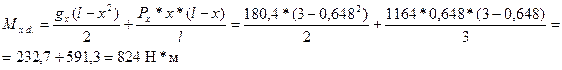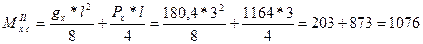 Здесь gx = g*cosa = 186*0,97 = 180,4 Н/м; Px = P*cosa = 1200*0,97 = 1164 Н; gy = g*sina = 186*0,243 = 45,2Н/м; Py = P*sina = 1200*0,243 = 291,6 Н. Изгибающие моменты в плоскости ската: - при сосредоточенной силе, приложенной в середине пролета, изгибающий момент равен нулю тогда