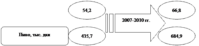 Рисунок 1.1 – Производство напитков в г. Нижневартовске Прогноз производства продукции на 2009 – 2010 годы по второму варианту составит 105,8 % – 104,7 % к предыдущему году соответственно. /10/. Во многом успешные продажи продукции собственного производства для производителей зависят от их взаимоотношений с оптовым торговым звеном Несмотря на наличие собственной сбытовой оптово-розничной сети, предприятия-производители не в состоянии обеспечить 100 % реализацию выпускаемой продукции. /11/. Специализирующиеся на алкогольной продукции оптовые предприятия имеют более разветвленную сбытовую сеть (клиентскую базу), более широкий ассортимент реализуемой продукции и отделы сбыта с большим штатом торговых агентов. Привлечение розничных продавцов за счет методов прямых продаж с использованием торговых агентов выглядит более продуктивно, чем продажи с оптовых ячеек заводов-производителей. /9, 12/. 1.2 Факторы, формирующие ассортимент и качество водок Водки в зависимости от применяемых при их изготовлении спирта и добавок, делятся на водки и водки особые (ГОСТ Р 51355-99) /13/. Водка – спиртной напиток, представляющий собой бесцветный водно-спиртовый раствор крепостью 41,0-45,0 %, 51,0 % и 56,0 %, с мягким присущим водке вкусом и характерным водочным ароматом (согласно ГОСТ Р 52190). Особая водка – водка крепостью 40,0-45,0 % с подчеркнуто специфическими ароматом и мягким вкусом, получаемыми за счет внесения ингредиентов (согласно ГОСТ Р 52190). Водки особые содержат различные вкусовые добавки, улучшающие вкус, запах и аромат. Однако эти ингредиенты не должны изменять органолептические показатели, определенные нормативным документом. /14/. Примечание: Крепость водки в весовых % или градусах. Градусом (0 ) называется масса абсолютно сухого спирта (г), содержащегося в 100 г водки. Один литр (дм3 ) водки 40 0 при температуре 15 0 С весит 953 г, а лист воды – 1 кг. Д.И. Менделеев доказал, что наибольшее сжатие наблюдается в том случае, если смесь содержит 45,88 % безводного спирта и 54,12 % воды (т.е. на молекулу спирта в растворе приходится три молекулы воды). В этом случае объем смеси будет минимальным, а удельный вес – максимальным. При такой концентрации спирт не обжигает пальцы. Но такое соотношение спирта и воды может быть получено только при смешивании их весовых количеств, а не объемов. Наряду с градусом применяется обозначение крепости в объемных процентах (% об.). На рынке России реализуется широкий ассортиментотечественных и импортных водок (достигает более 200 наименований). Во многих регионах выпускается значительное количество новых наименований водок. Разнообразие водок обусловлено использованием различных сортов спирта-ректификата, вкусовых и ароматических добавок, а также качеством воды и степенью очистки водно-спиртовой смеси. /15, 16/. Основными факторами, формирующими качество водки, являются сырье, и степень очистки вводно-спиртовой смеси. Сырье для получения водки делится на основное (этиловый спирт, вода) и вспомогательное (смягчающие вкусовые добавки, пряности, ароматические травы, свежие и сушеные плоды, ягоды, овощи, иногда красители). Основное разнообразие водок обусловлено подвидом и сортом спирта-ректификата, качеством воды, вспомогательным сырьем (добавками), а также степенью очистки вводно-спиртовой смеси. При производстве водки используют спирт-ректификат сортов б