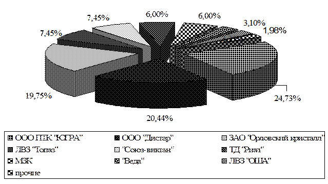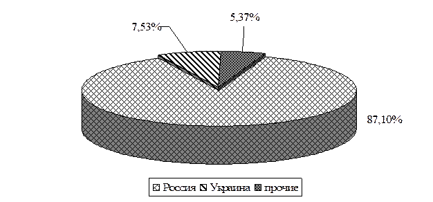 Рисунок 2.2 – Страны-производители водок, представленные в продовольственном магазине «Зодиак» (г. Нижневартовск) Из данных рисунка 2.2 видно, что в магазине «Зодиак» (г. Нижневартовск), в основном, реализуется продукция, произведенная в России (81 из 93 разновидностей водок - 87,10 %), доля остальных стран-производителей невелика: Украина – 7,53 %, прочие – 5,37 %. Из данных рисунка 2.3 видно, что российская продукции наиболее широко представлена продукция ООО ПТК «ЮГРА» – 24,73 %, на втором месте по распространенности продукция ООО ЛВЗ «Дистра» (г. Нальчик, КБР) - 20,43 %, третье место – продукция ЗАО «Орловский кристалл» (г Орел) (19,75 %). Равные доли занимают ЗАО ЛВЗ «Топаз» (г. Пушкино) и ЗАО «Союз-виктан» - 7,45 %, ООО ТД «Риал» (г. Москва) и ОАО МЗ «Кристалл» (г. Москва) - 6,00 %. На долю ЗАО «Веда» (Ленинградская область) и ООО ЛВЗ «ОША» (г. Омск) приходится по 3,1 %. Доля остальных производителей на рынке г. Нижневартовска невелика и составляет менее 3 % - ООО «Омсквинпром», ООО «Традиции качества» (г. Краснознаменск), ОАО «Кристалл Гросс» (г. Москва) и т.д.