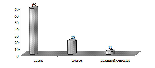 Рисунок 2.3 – Производители алкогольной продукции, представленной в продовольственном магазине «Зодиак» (г. Нижневартовск) На рисунке 2.4 представлена структура ассортимента водок в зависимости от используемого сорта спирта. Как видно из данных рисунка 2.4, потребителю в основном предлагаются водки, в состав которых входит спирт сорта «Люкс» (69 %), 20 % - водки, в состав которых входит спирт сорта «Экстра» и 11 % из спирта высшей очистки. Согласно ГОСТ Р51355-99 «Водки и водки особые. Общие технические условия» водки в зависимости от применяемых при их изготовлении спирта и