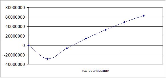 PI = (22664905,37 + 20649529,27 + 18312889,45 + 16072729,12 + + 14115805,41) / 29162340,69 = 3,1484 Так как PI=3,1484 > 1, то по правилу принятия решения можно сделать вывод об эффективности проекта. Определим период возврата инвестиций по формуле: Твоз = tх + (NPVt / ДДПt+1) Твоз = 2 + (6497435,32 / 20649529,27) = 2,315 Определим период окупаемости проекта по формуле: Ток = Твоз – Тин Ток =2,315 – 1=1,315 года. Следующим этапом вычислений является нахождение такой стоимости технологической линии, при которой чистый дисконтированный доход нарастающим итогом будет равен нулю. Расчеты представлены в таблице 6.10. Таблица 6.10.