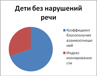 Рис. 3. Наглядное представление социометрического статуса дошкольников. Для выявления особенностей характера межличностных взаимоотношений в группах был проведен сравнительный анализ. Сравнивались результаты групп по уровню КБВ (коэффициент благополучия взаимоотношений) и ИИ (индекс изолированности), позволило обнаружить различия данного параметра. В группе детей с нарушениями речи он составляет 40% детей, в группе детей без нарушений речи – 70% детей. Это говорит о том, что большинство детей без нарушений речи находятся в благоприятной статусной категории. В то же время, анализ результатов индекса изолированности показывает, что в группе детей без нарушений речи, имеющих такой статус, значительно меньше, чем во второй группе. Их соотношения равны: 60 % в группе детей с нарушениями речи, 30% у детей без нарушений. Таким образом, можно констатировать, что индекс изолированности действительно отражает существенные качественные характеристики внутригрупповых процессов. Наглядно это представлено на рисунке 4. В группе детей без нарушений речи, взаимный выбор встречался чаще, что свидетельствует о социально – психологической благополучной выводом. В группе детей с нарушениями речи это было в единичном случае.
