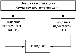 Принципиально различают две формы мотивации – внешнюю и внутреннюю.[31;с.70] Внешняя мотивация – это средство достижения цели, например, заработать деньги, получить признание, занять вышестоящую должность. При этом она может использоваться в двух направлениях: как стимул при ожидании преимуществ – принцип надежды; как средство давления при ожидании недостатков – принцип страха. Внешняя мотивация непосредственно влияет на поведение, но эффективность ее действия ограничена, пока она воспринимается в качестве стимула или давления. Схема 2. Внешняя мотивация
