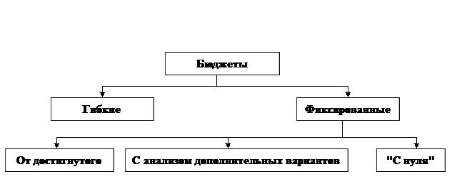 Рис. 1 - Классификация подходов к разработке бюджетов Гибкий бюджет показывает размеры затрат и результаты при различном объеме деятельности соответствующего центра ответственности. В зависимости от объема деятельности переменные и смешанные затраты меняются, а постоянные остаются неизменными. Поэтому в гибком бюджете указываются ставка переменных затрат на единицу продукции и приоритет смешанных затрат на единицу прироста объема продукции. Эта ставка есть норма, умноженная на цену. Постоянные затраты выделяются отдельно. С помощью формулы, связывающей затраты и объем производства, можно разрабатывать сметы и планы для различных уровней деловой активности. Гибкий бюджет наилучшим образом подходит для центров полностью регулируемых затрат, а также для центров выручки, т.к. он показывает, каким образом руководитель может воздействовать на затраты или выручку, изменяя объем выпуска или реализации. По принципу гибкого бюджета планируют выручку, затраты на основные материалы, сдельную зарплату и др. Фиксированный бюджет не меняется в зависимости от изменения уровня деловой активности, поэтому его используют для планирования частично регулируемых затрат, которые не зависят непосредственно от объема выпуска и для которых взаимосвязь "вход-выход" носит не столь явный характер. Фиксированные бюджеты используют прежде всего для центров частично регулируемых затрат, а также для других видов центров ответственности. Примером фиксированных бюджетов может служить план затрат на НИОКР, на рекламу и др. Выделяют следующиеразновидности фиксированных бюджетов : −бюджеты «от достигнутого» составляют на основании статистики прошлых периодов с учетом возможного изменения условий деятельности предприятия (поэтому их называют «приростными»). Например, общехозяйственные затраты обычно планируют «от достигнутого» (такие бюджеты встречаются наиболее часто). −бюджеты с проработкой дополнительных вариантов отличаются от обычных приростных бюджетов анализом различных вариантов (рассматривается несколько вариантов в сравнении). Этот подход является промежуточным между «от достигнутого» и бюджетом «с нуля». −бюджеты «с нуля» разрабатываются исходя из предположения о том, что для данного центра ответственности бюджет составляется впервые. Это избавляет от груза прошлых ошибок. Наиболее сложной разновидностью фиксированных бюджетов является бюджетирование «с нуля» : −определение целей для всех видов деятельности, за которые отвечает менеджер каждого центра ответственности; −установление альтернативных вариантов ведения каждого из видов деятельности; −установление критериев достижения целей; −оценка эффекта (степени достижения цели) от каждого из вариантов по установленным критериям; −оценка затрат для каждого из вариантов; −оценка возможных уровней ассигнований; −определение факторов, ограничивающих объем деятельности центра ответственности; −формирование оптимального набора видов деятельности для каждого возможного уровня ассигнований (оптимальный набор формируется с использованием математических методов - линейного программирования, моделирования, теории массового обслуживания и др.). Данную разновидность фиксированных бюджетов рационально проводить для частично регулируемых затрат. Сфера приме