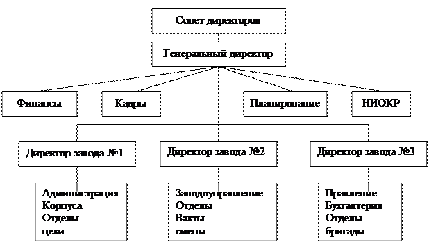Рис.2.5. элементы организации Структура - это свойство системы, определяющее характеристику этой системы. Основные элементы структуры это: - звенья или структурные подразделения. Структурные подразделения – это группа людей, деятельность которых сознательно координируется и направляется; - уровни (ступени) определяют иерархию системы; - связи определяют взаимозависимость и взаимоотношение звеньев. Связи бывают: вертикальные (властные отношения), горизонтальные (согласовывание), линейные, функциональные. Структура управления обеспечивает выполнение общих и конкретных функций управления, сохраняет целесообразные вертикальные и горизонтальные связи и разделение элементов управления. Организационная структура регулирует разделение задач по отделениям и подразделениям; их компетентность в решении определенных проблем; общее взаимодействие этих элементов. Основные законы рациональной организации: - упорядочение задач в соответствии с важнейшими последовательностью процесса; - приведение управленческих задач в соответствии с принципами компетентности и ответственности; - обязательное распределение ответственности; - короткие пути управления; - баланс стабильности и гибкости; способность к целеориентированной самоорганизации и активности; желательность стабильности циклически повторяемых действий. Структура системы представляет собой совокупность взаимосвязей между частями (подсистемами и элементами) данной системы. Очевидно, что для каждого из возможных вариантов состава системы существует по крайней мере один вариант структуры, однако не исключено и многообразие вариантов структур, например, функциональная, дивизионная, территориальная, продуктовая, холдинговая, инновационная, матричная и др. К примеру, при функциональной структуре на предприятии создаются подразделения по важнейшим направлениям его деятельности: производство, сбыт, финансы, поставки и т.д. Данная структура отличается высокой степенью централизации, четкими и надежными коммуникациями Дивизионная организационная структура – это ряд связанных между собой предприятий, получивших большую самостоятельность и имеющих функциональную структуру организации. Корпорация с дивизионной структурой имеет штаб-квартиру, офисы, суперотделения, отделения, суботделения. В основе перехода фирм к дивизионной структуре лежит диверсификация производства. (смотри рис.2.6.). При территориальной структуре организации каждое отделение фирмы практически отвечает за разработку, производство и сбыт однородной продукции на данной территории. Продуктовая структура – это разновидность дивизионной структуры, при которой каждое отделение специализируется на выпуске специфического товара. Холдинговая структура. Организация в особо крупных и диверсифицированных фирмах, где отделения имеют свободу деятельности. С центром их связывает финансовая зависимость от главной компании, которой принадлежит контрольный пакет акций. Инновационная структура , как правило, двухсекторная. В первом секторе выпускается традиционная высокоприбыльная продукция, во втором разрабатывается и осваивается выпуск новейшей продукции, ведутся работы на «будущие деньги».[ 3, с.46] Функциональная структура