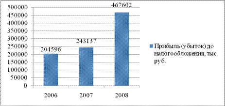 Рисунок 3. Динамика прибыль от продаж ОАО «Каустик» за период 2006-2008 гг. Источник: составлено автором. Следующий показатель прибыли в Отчете о прибылях и убытках – прибыль (убыток) до налогообложения – рассчитывается: ПдН = ПП+%пол-%упл+Ддр+ПрД-ПрР, где ПдН – прибыль (убыток) до налогообложения, %пол – проценты к получению, %упл – проценты к уплате, Ддр – доход от участия в других организациях, ПрД – прочие доходы, ПрР – прочие расходы. Прибыль до налогообложения ОАО «Каустик» составила: · в 2006 году 493 340+3 027-345 351+0+4 525 697-4 472 387=204 596 тыс. руб. · в 2007 году 665 917+17 593-412 696+0+3 429 694-3 457 371=243 137 тыс. руб. · в 2008 году 1 099 765+47 829-511 736+0+3 100 118-3 268 284=467 602 тыс. руб. Теперь рассмотрим динамику прибыли (убытка) до налогообложения ОАО «Каустик» (рис. 4). В 2007 году прибыль ОАО «Каустик» до налогообложения возросла по сравнению с показателем 2006 года на 18,8%. В 2008 году темп роста прибыли до налогообложения значительно увеличился, рост составил 92,3%. Столь значимое увеличение прибыли до налогообложения ОАО «Каустик» в 2008 году связано с ростом валовой прибыли в 2008 году по сравнению с 2007 годом, а так же с сокращение прочих расходов предприятия в 2008 году по сравнению с 2007 годом. Рисунок 4. Динамика прибыли (убытка) до налогообложения ОАО «Каустик» за 2006-2007 гг. Источник: составлено автором. Чистая прибыль (убыток) отчетного периода рассчитывается в Отчете о прибылях и убытках следующим образом: ЧП = ПдН±ОНА-ОНО-НП-Пр, где ЧП – чистая прибыль (убыток) отчетного периода, ОНА – отложенные налоговые активы, ОНО – отложенные налоговые обязательства, НП – сумма налога на прибыль, Пр – прочие обязательные платежи. Чистая прибыль ОАО «Каустик» составила: · в 2006 году 204 596-426-11 556-49 894-4 851=137 869 тыс. руб. · в 2007 году 243 137-314-19 434-57 987-2 401=163 001 тыс. руб. · в 2008 году 467 602+245-20 594-78 903-1 650=366 700 тыс. руб. Чистая нераспределенная прибыль ОАО «Каустик» в период 2006-2007 гг. увеличивалась (рис. 5). Чистая прибыль предприятия в 2007 году увеличилась на 18,23% по сравнению с величиной чистой (нераспределенной прибыли) 2006 года и составила 163 001 тыс. руб. В 2008 году, несмотря на мировой финансовый кризис, чистая прибыль ОАО «Каустик» увеличилась в 2,25 раз по сравнению с аналогичным показателем 2007 года и достигла уровня 366 700 тыс. руб.: