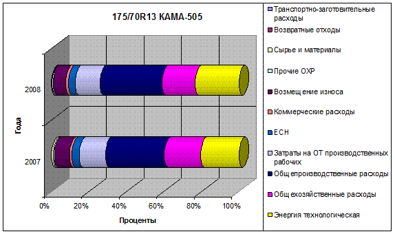 Увеличение общепроизводственных расходов по а/п 175/70R13 КАМА-204 на 143,30 % в динамике в 2008 году по сравнению с 2007 годом связано с увеличением расходов на: - рост зарплаты вспомогательных рабочих и ИТР; - рост цен на энергоносители (отопление, освещение, стоки, - на текущий и капитальный ремонт оборудования. Увеличение затрат на оплату труда производственных рабочих на 127,57% в динамике и соответственно ЕСН на 127,25% в динамике в 2008 году по сравнению с 2007 годом связано с ростом тарифов и окладов. Если в 2007 году расходы на энергию технологическую составляли 21,82% в себестоимости продукции, то в 2008 году они уже составили 24,53% в себестоимости. Это объясняется ростом цен на энергоносители. Увеличение расходов на возмещение износа на 111,10% в динамике свидетельствует об уменьшении объема выпуска продукции, о значительной работе предприятия по повышению качества выпускаемой продукции. Коммерческие расходы также увеличились на 164,32% в динамике. Увеличение данной статьи затрат свидетельствует о том, что были включены затраты на рекламу в расходы переработчика. В 2008 году произошло также в сравнении с 2007 годом увеличение общехозяйственных расходов на 10168 рублей. По остальным показателям в структуре себестоимости произошли уменьшения затрат на 1000 штук. На рисунке 2.2 показана структура затрат себестоимости а/п 175/70R13 КАМА 204 за 2007 и 2008 года.