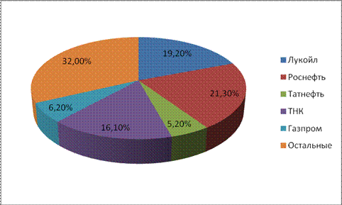 Рис 1. Доля добычи нефти компаний в общем объеме добычи в России за 2005 год.